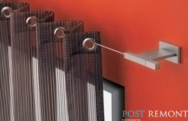 Роль основной детали для закрепления штор подобного карниза играет стальная или пластиковая струна. Подобный тип карнизов не применяется для крепления штор из тяжелого текстиля. Струна, естественно, может выдерживать большие перегрузки, однако сделать ее достаточную натяжку, чтобы не провисала середина, фактически не возможно.
